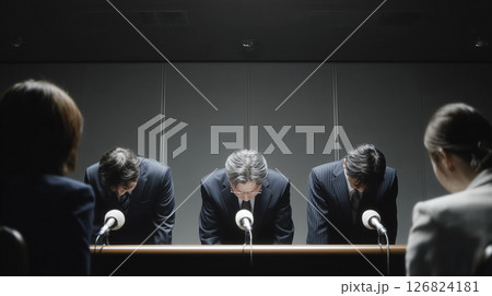 謝罪記者会見で頭を下げるスーツのビジネスマンたち