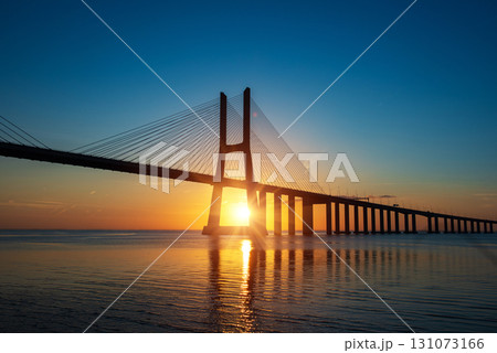Vasco da Gamma road bridge in Portuguese capital Lisbon at sunrise.