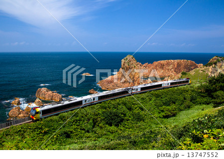 ガンガラ穴からみた五能線の列車 リゾートしらかみ 青森県深浦町