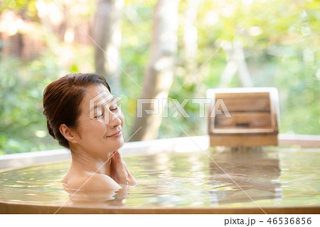 シニア女性 露天風呂 入浴 温泉 旅行イメージ