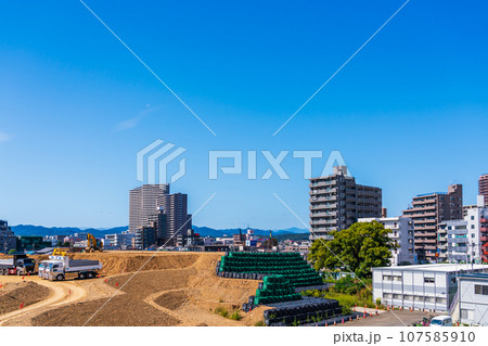 日本の相模原都市景観 橋本駅前で進む中央新幹線の神奈川県駅(仮称)新設工事や鉄塔などを望む