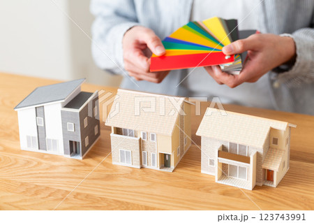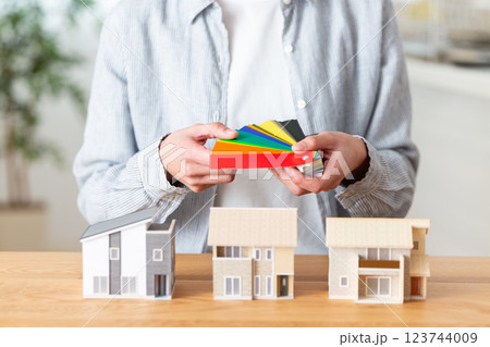 住宅リフォームのカラーシミュレーションをするミドル女性