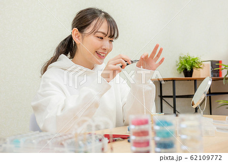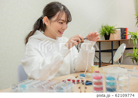 ハンドメイド ビーズアクセサリー作りをする20代の女性