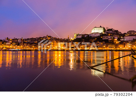 ポルトガル 夕暮れ時のポルトの旧市街とドゥエロ川