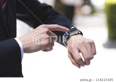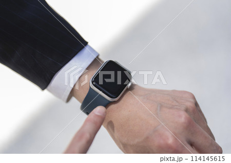 デスクワーク中にスマートウォッチに触れる30代の女性
