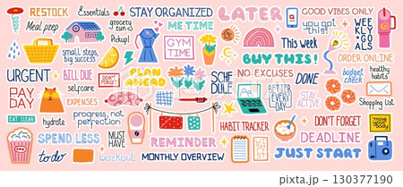 Bullet journal stickers. Daily planner quote pack. Cute funny summer diary or weekly scrapbook template. Motivation phrase. Deadline reminder. Notebook list label. Vector design icons set