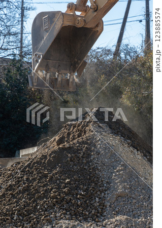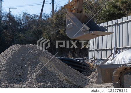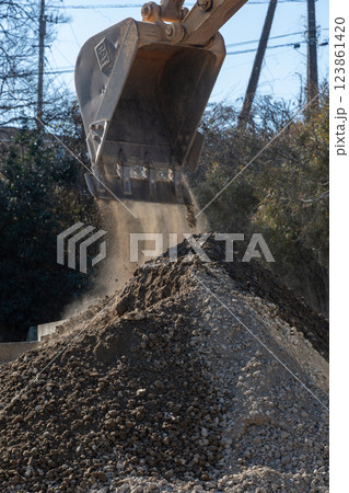 パワーショベルと建築資材