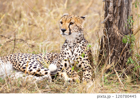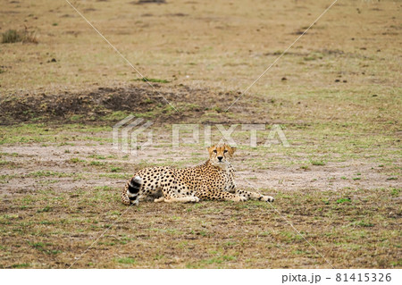 サバンナの大地で休んでいる野生のチーター(ケニア、マサイマラ国立保護区)