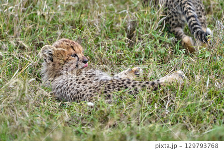 仲良くじゃれ合う2匹のかわいいチーター(ケニア、マサイマラ国立保護区)
