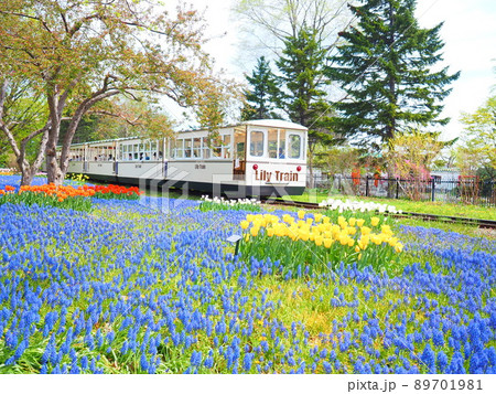 北海道の風景 春の百合が原公園 花畑とリリートレイン