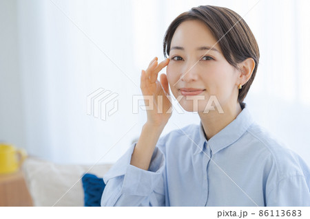 目元のシワ・たるみを美容グッズでケアするアジア人女性