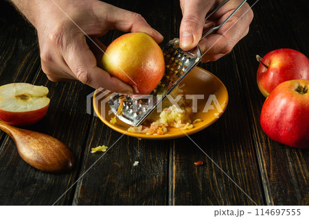 The hands of a cook with a grater grate a raw apple on the kitchen table. Low key concept of preparing a healthy fruit breakfast