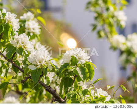 White blossoming apple trees in the sunset light. Spring season, spring colors.