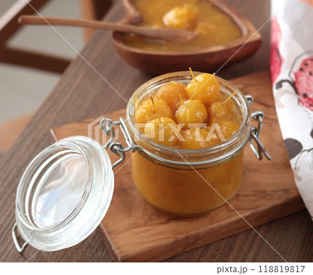 Glass jar of apple jam on wooden olive board. Home made fruit from garden. Kitchen interior and organic food.