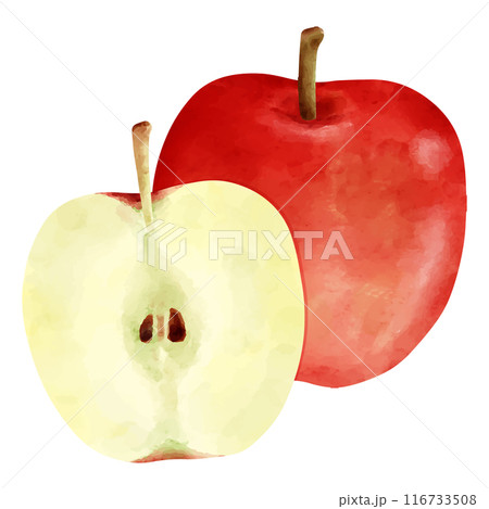 赤いりんごの手描き水彩イラストセット_半分にカットしたりんご_新鮮なフルーツ