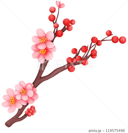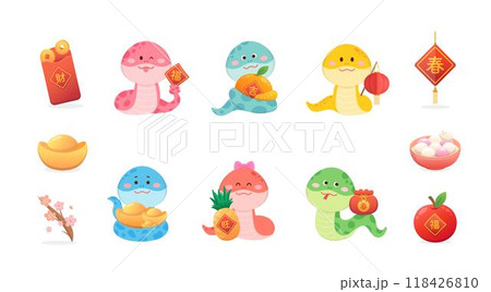 蛇角色或卡通人物與中國新年或元宵節的向量插畫,湯圓與梅花