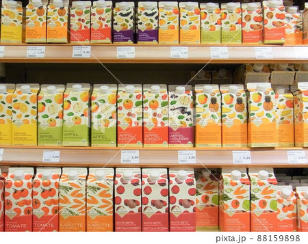 ヨーロッパのスーパーに陳列されているビタミンカラーのジュース