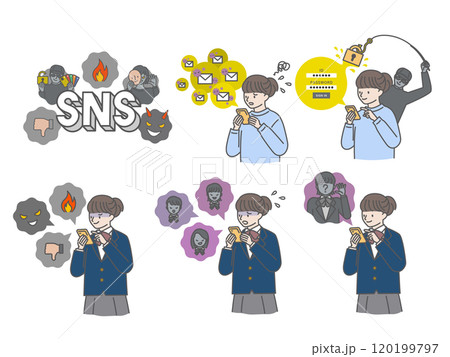 子供のSNSトラブル・ネットトラブルの被害イラストセット(女の子)