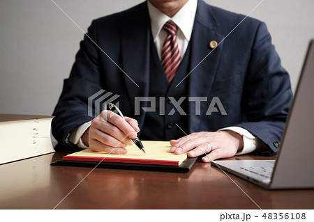リーガルパッドにメモをする男性弁護士の手元・バッジあり