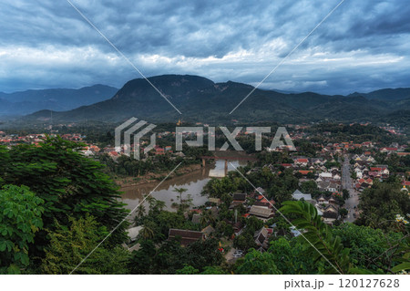Scenic view from Phousi Hill of town in Luang Prabang, Laos with mountains in the background under cloudy sky