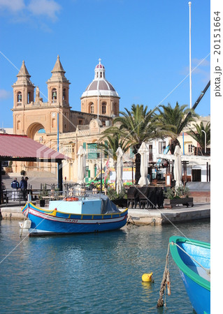 マルタ島のマルサシュロックの街並みと伝統船ルッツの風景