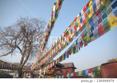 ネパールの青空の下で風になびく五色の祈りの旗タルチョ