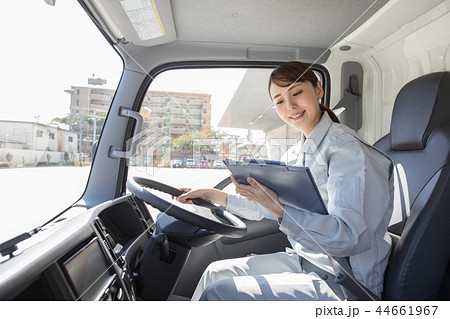 軽貨物自動車のドライバーの女性がバインダーと筆記用具を持っている。引越し業者や配送の仕事をしているイ