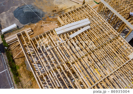 Aerial view of unfinished brick house with wooden roof structure under construction.