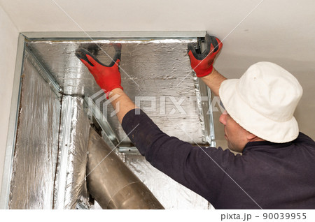 Mineral wool with foil, thermal protection for the wall from the fireplace, installation of metal beacons, screwing the beacons to the wall with a screwdriver.