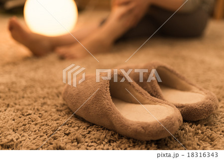 床暖房の部屋でソファに座るスリッパを履いた女性の足