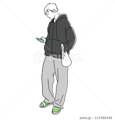コンビニ前でスマホを見る男性 カジュアルストリートファッションイラスト