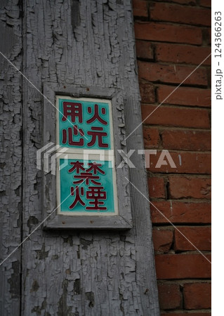 古い工場の火元用心と禁煙の張り紙
