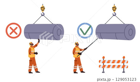 Safety in workplace. Correct and incorrect operation of fitter with hoisting crane. Construction site. Weight lifting. Overhead of careful build workers. Security protection. Vector concept