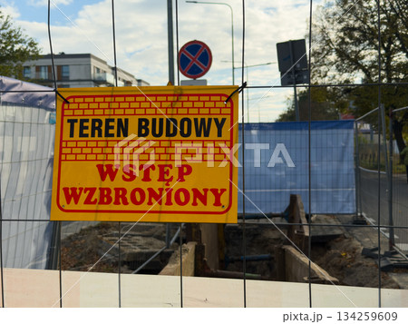 Yellow warning sign Construction Site Entry Forbidden on fence, stressing urban safety, restricted access, outdoor daylight