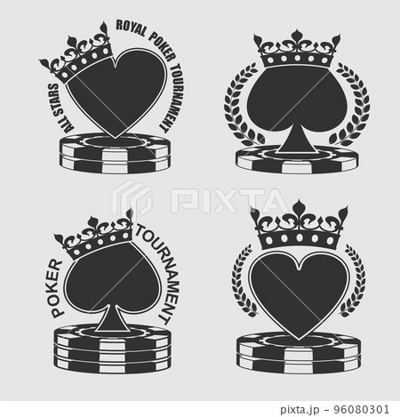 Poker tournament emblem isolated monochrome logo on white background. Spades in crown and laurel wreath. Royal hearts on stack of casino chips. Vector graphic casino sign design set