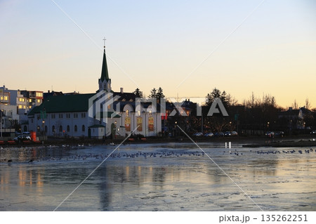 北欧の島国アイスランド 首都レイキャヴィークのチョルトニン湖畔に建つレイキャヴィークフリー教会