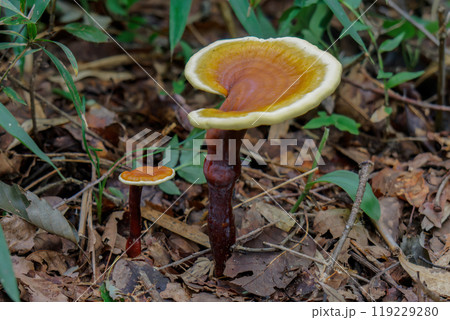 きれいに傘を開いた成菌と幼菌との2本の霊芝