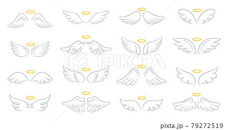 Vector set of different wings with a halo. Hand-drawn, doodle elements isolated on white background.