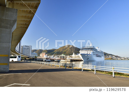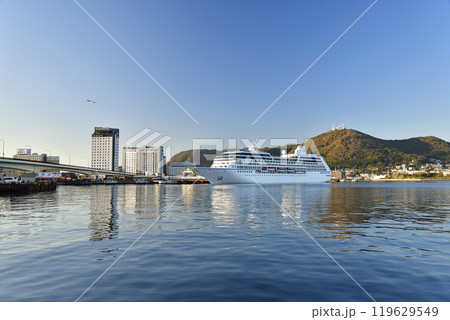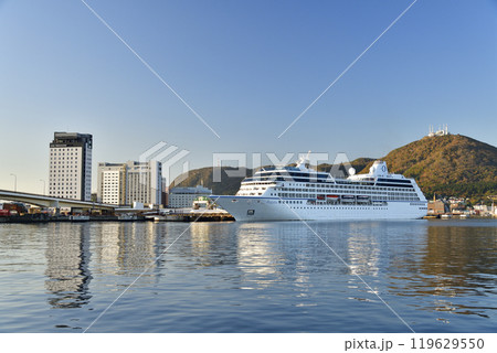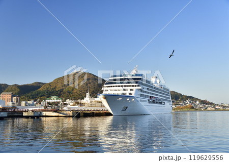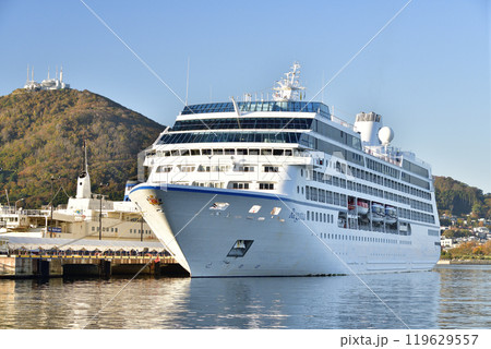 秋の北海道函館市で函館港に寄港するクルーズ船レガッタ号の風景を撮影