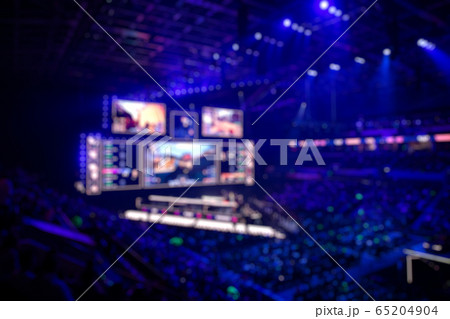 Blurred background of an esports event - Big illuminated main stage of a computer games tournament located on a big stadium. Tribunes are full of video games fans.