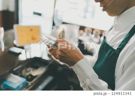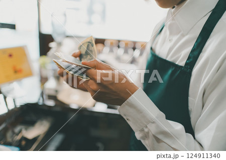 Asian woman cashier checking order customer and pressing cash register at counter in restaurant