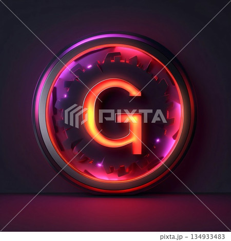 Glowing neon letter G in round frame on dark background. 3D rendering