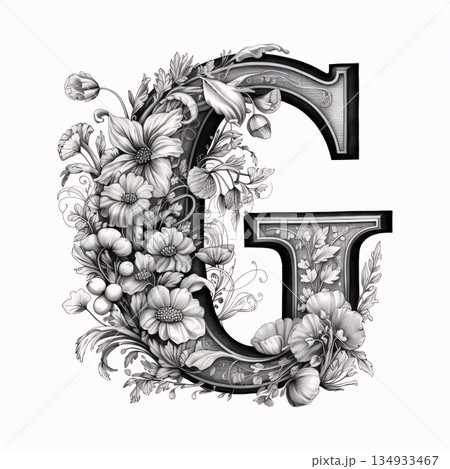 Vintage floral capital letter G with flowers. Hand-drawn illustration.