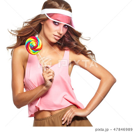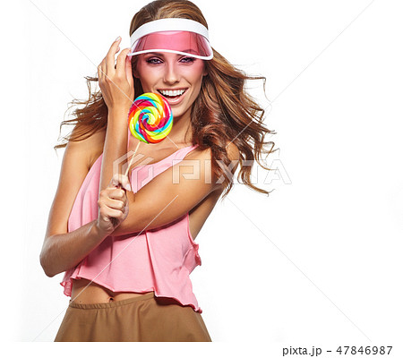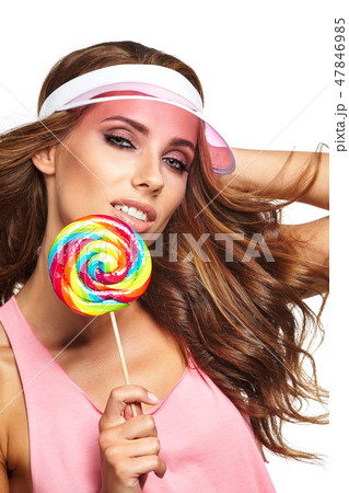 Bright makeup. Beauty Girl Portrait holding Colorful lollipop. P