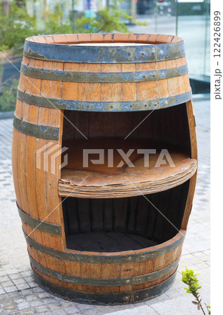 An empty wooden barrel on a city street, part of the city's decor and architecture