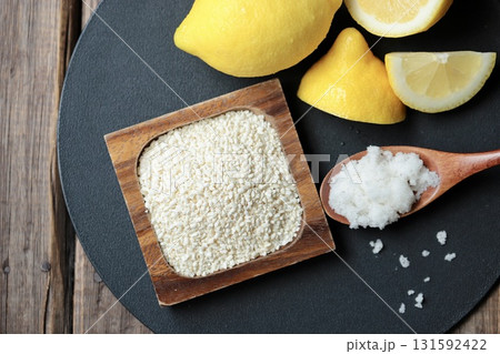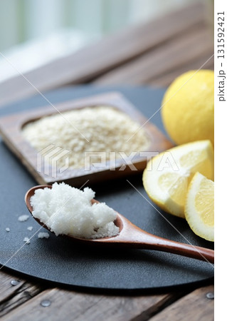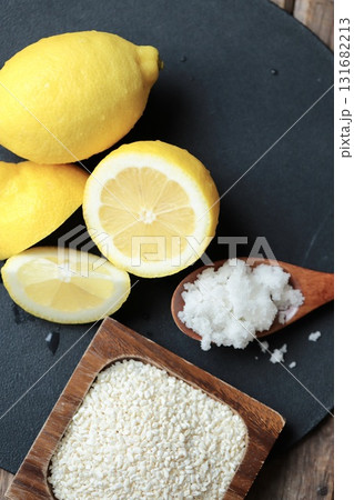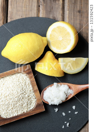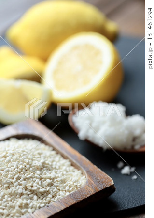 混ぜる前のレモン麹の材料 米麹と粗塩とノーワックスレモン