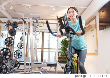 スポーツジムのエアロバイクで運動する女性(健康・ダイエット)