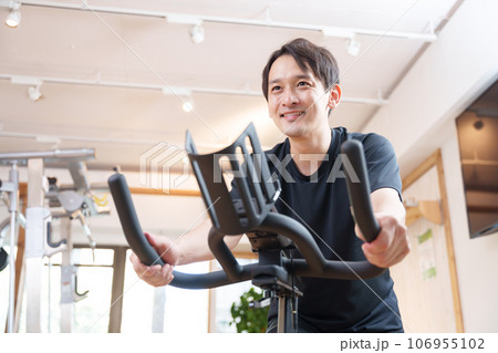 スポーツジムのエアロバイクで運動する男性(健康・ダイエット)