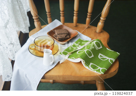 手作りブックカバーを付けた文庫本、ビスケットと紅茶、読書