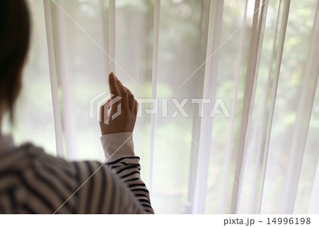 外気浴 風に当たる親子 赤ちゃん 新生児 レースカーテン